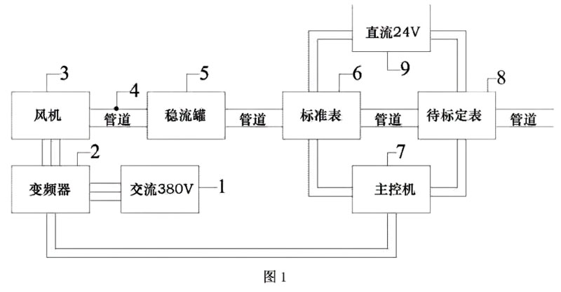 直流電源分別對標(biāo)準(zhǔn)表、熱式氣體質(zhì)量流量計及主控機(jī)供電,標(biāo)準(zhǔn)表及熱式氣體質(zhì)量流量計的數(shù)字輸出端分別連接主控機(jī)的輸入端,主控機(jī)的控制輸出端連接變頻器技術(shù)效果:現(xiàn)有技術(shù)中,需要到其他滿足標(biāo)定條件的實(shí)驗(yàn)室去進(jìn)行標(biāo)定,產(chǎn)品每次標(biāo)定需要花費(fèi)上千元,則公司每年節(jié)省了幾十萬的費(fèi)用,且本實(shí)用新型所設(shè)計的標(biāo)定系統(tǒng)準(zhǔn)確度極高,操作簡便,適于大力的推廣和使用。