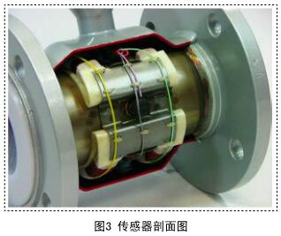其中B、D、S為常量,流量與感應(yīng)電動勢U成正比關(guān)系,因此,測得感應(yīng)電動勢U,即可得到流體流量。由此可見,電磁流量計正常運(yùn)行需要有穩(wěn)定的磁場,而磁場正是靠傳感器線圈內(nèi)的勵磁電流來產(chǎn)生的。勵磁線圈如圖2所示。對線圈對稱安裝在傳感器正對的兩側(cè),以產(chǎn)生均勻的磁場,傳感器剖面圖如圖3所示