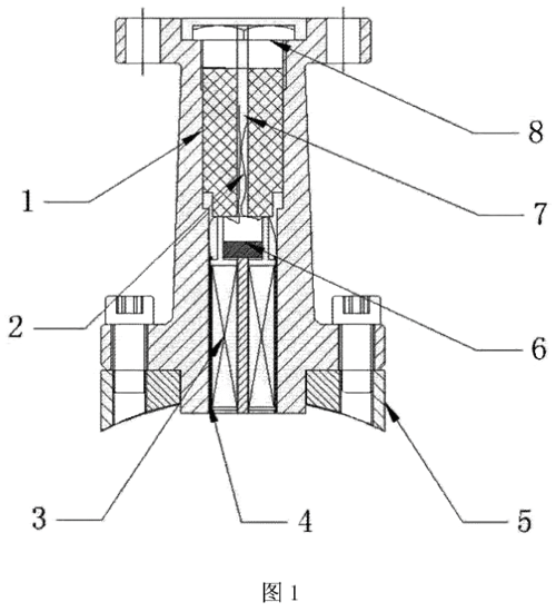 如圖1所示,該傳感器連接桿包括連接桿本體1和連接座5,連接桿本體1經(jīng)內(nèi)六角螺栓緊固在連接座5上,傳感器線圈3裝入橡膠防塵套4中后一并裝入連接桿本體1內(nèi),利用橡膠防塵套4的伸縮性使傳感器線圈3固定在連接?xùn)e本體1內(nèi),**磁鋼6安裝在連接桿本體1內(nèi)位于傳感器線圈3上方,密封圈2裝入連接桿本體1內(nèi)由六角壓冒8壓實(shí),檢測線7從密封圈2中引出。安裝時,連接座孔與導(dǎo)管上鉆孔對齊,連接座點(diǎn)焊在導(dǎo)管上,連接桿本體與顯示器采用M6內(nèi)六角螺栓固定。