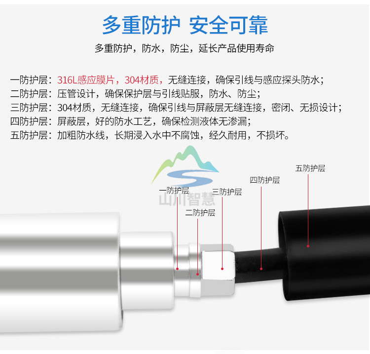 4、在有較大振動(dòng)的使用場合,可在變送器上纏繞鋼絲,利用鋼絲減震,以免拉斷電纜線。