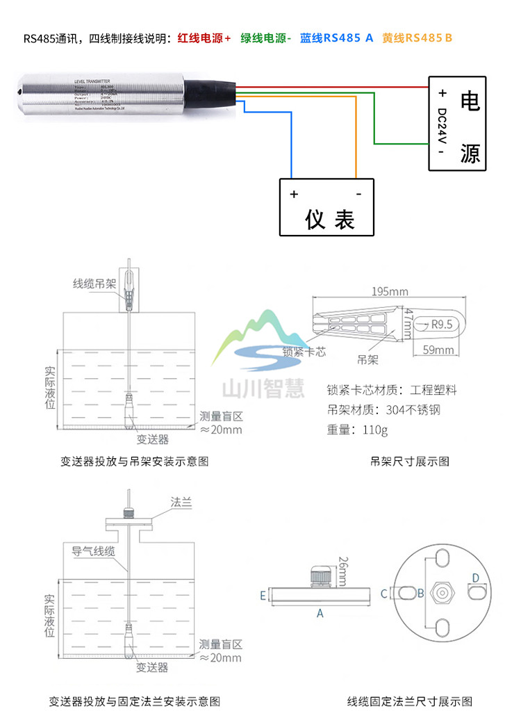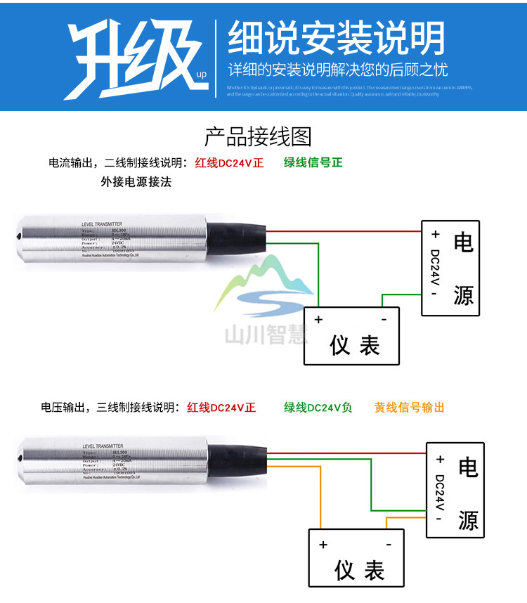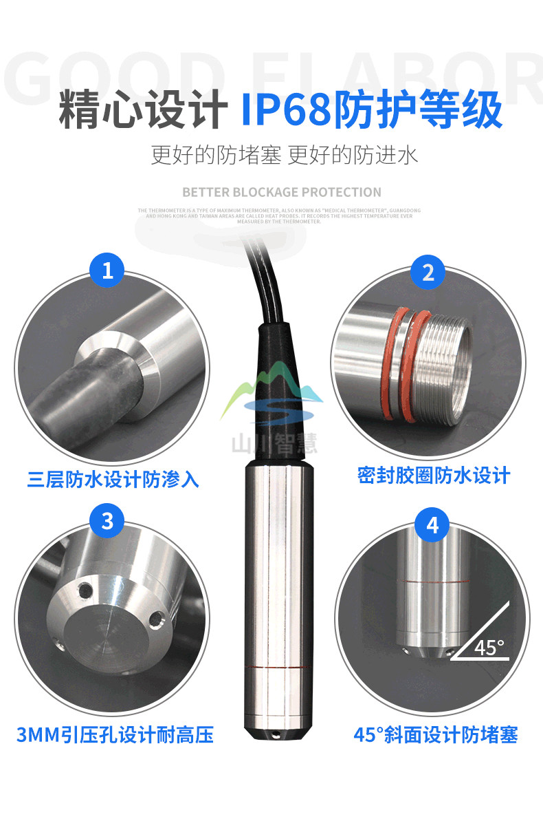 1、液位計(jì)安裝在靜止的深井、水池中時(shí),通常把內(nèi)徑Φ45mm左右的鋼管 (不同高度打若干小孔,以便水通暢進(jìn)入管內(nèi))固定于水中,然后將放入鋼管中即可使用;