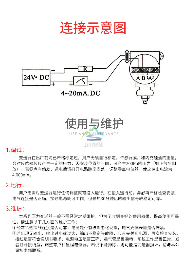 電氣連接:變送器外殼有2個M2*1.5螺孔,用以連接電線管,殼體內(nèi)有接線端的測量。如與通訊器相連接時,則必須固定在測量螺絲片上。