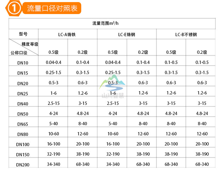 ① 公稱壓力(MPa):0.6、1.0、1.6、2.5、4.0  ② 工作溫度:(℃):-10~60  ③ 精度等級(jí):0.5、0.2  ④ 流量范圍:(m3/h)