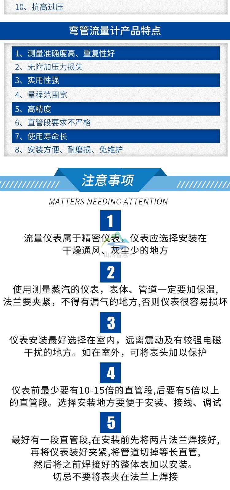 準確度高,穩(wěn)定性好 阿牛巴的準確度為±1%,穩(wěn)定性為±0.1%,它能夠保持長期輸出非常穩(wěn)定的差壓信號,保證輸出差壓信號與管道流量的映射關系。這是因為在使用過程中的磨損,腐蝕以及粘附的油污灰塵等因素對阿牛巴流量計系數影響不大,但這些因素使孔板的流量系數增大,而且會增加到20%以上,由 此產生的誤差將也達到20%以上。從中我們可以看出阿牛巴的準確度是長期穩(wěn)定的。設計合理,安裝方便、經濟 阿牛巴重量輕,安裝拆卸方便,無需起重工具,產品系列中有可以在被測管道不斷流——不 不停車的情況下進行安裝或拆卸,由于阿牛巴的重量輕,安裝拆卸方便,因此這方面可以為你節(jié)省可觀的安裝費用。例如:在直徑200mm的管道上安裝流量計,阿牛巴只有一條長150mm的焊縫,而孔板有2條共長1200mm 長的焊縫。就工時來講,安裝一只阿牛巴流量計只需要1.5工時,而安裝一只孔板卻需12工時,有利于管道布局 阿牛巴不僅適用于圓形管道,也適用于矩形管道及埋設在地面以下任何深度的管道。 阿牛巴上下游直管段的長度要求比孔板低得多,當安裝在彎頭后面距離2倍管徑處,仍然可以得到穩(wěn)定 的、很高的準確度,這是阿牛巴的獨特優(yōu)點,給管道尤其是大直徑管道的布局設計帶來了很大的靈活 性,節(jié)省了費用壓力損失小,能源損耗少,**壓力損失是動力損耗,阿牛巴的**壓力損失僅占差壓的2~15%,而一般孔板的**損失卻要占差壓的40~80%,從下圖可以看出阿牛巴的**壓損比孔板的壓損要小得多,隨著管徑的增大,阿牛巴**壓損可忽略不計。例如:在直徑1000mm的管道上使用阿牛巴流量計,一年的能量損耗只有幾百元,當使用孔板時,一年的能量損耗高達2萬余元,這對當今大力設法節(jié)約能源來說是很有意見的。