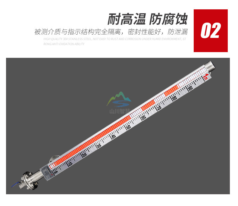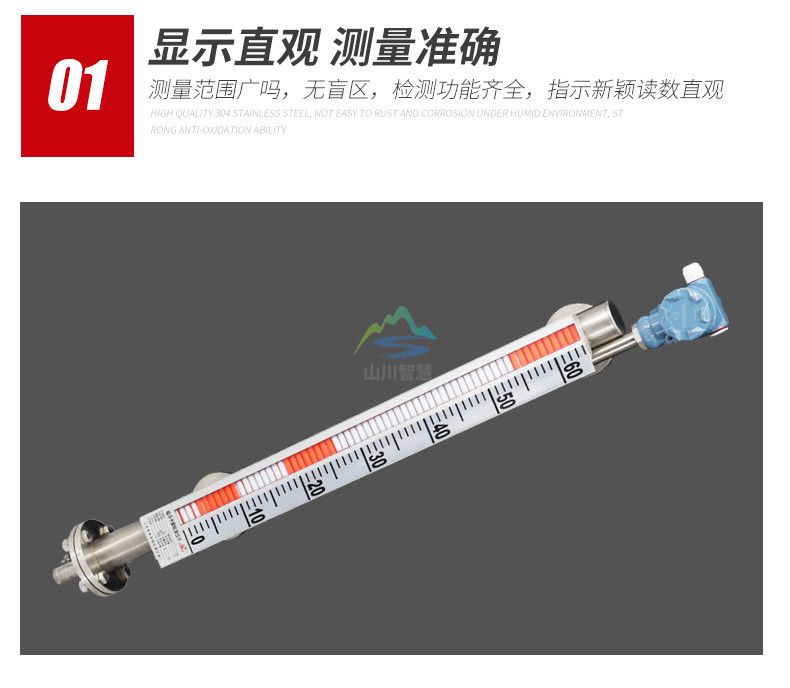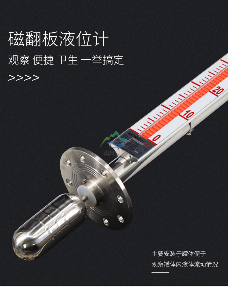 本公司生產(chǎn)的磁翻板液位計應(yīng)用液位計根據(jù)浮力原理和磁性耦合作用研制而成。當被測容器中的液位升降時,液位計主導管中的浮子也隨之升降,浮子內(nèi)的***磁鋼通過磁耦合傳遞到現(xiàn)場指示器,驅(qū)動紅、白翻柱翻轉(zhuǎn)180度,當液位上升時,翻柱由白色轉(zhuǎn)為紅色,當液位下降時,翻柱由紅色轉(zhuǎn)為白色,指示器的紅、白界位處為容器內(nèi)介質(zhì)液位的實際高度,從而實現(xiàn)液位的指示。