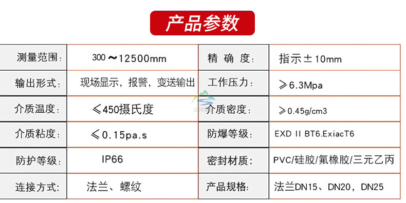 測量范圍:150~8000mm,對中心距超過8000mm的或遠(yuǎn)輸條件不允許超過長度的液位計可采用分段制造。