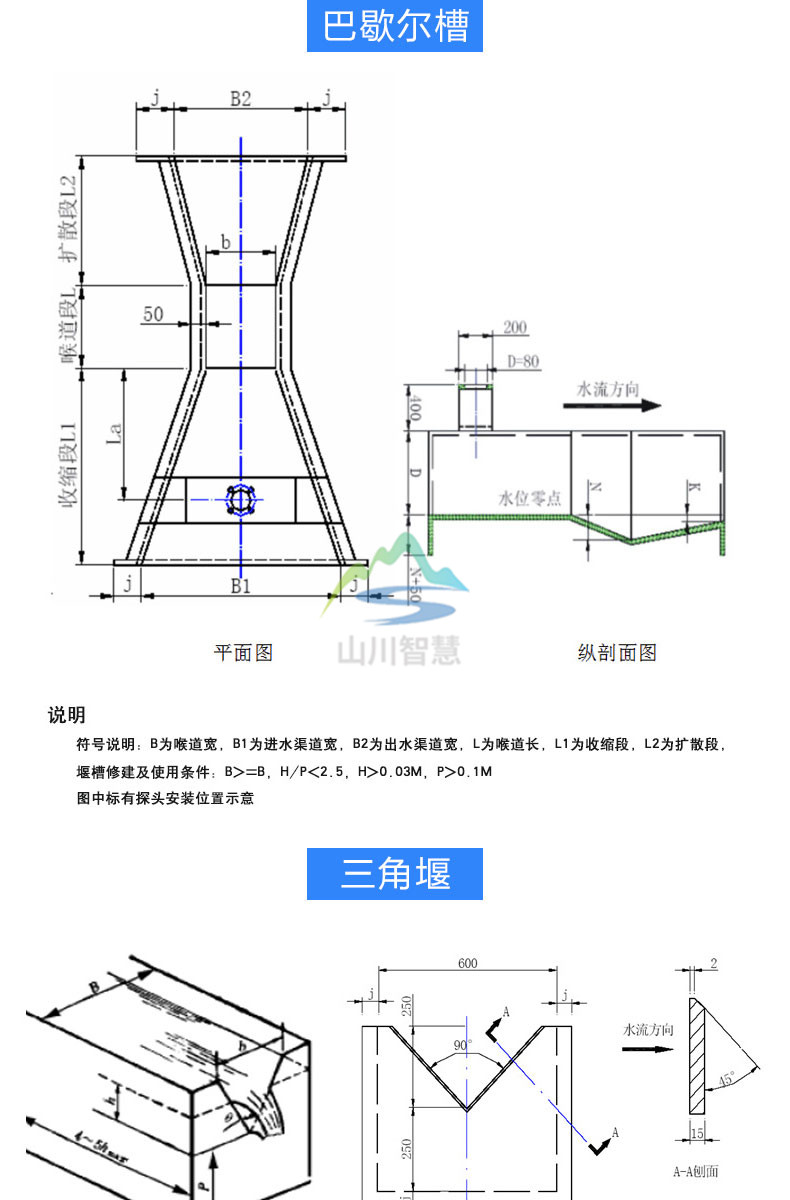 明渠流量計(jì)測(cè)量量水堰槽內(nèi)的水位,再按相應(yīng)量水堰槽的水位流量關(guān)系反算出流量.普通明渠內(nèi)流量與水位之間的對(duì)應(yīng)關(guān)系,受渠道的坡降比和表面糙度影響。在渠道內(nèi)安裝量水堰槽,產(chǎn)生節(jié)流作用,使明渠內(nèi)的流量與液位有固定的對(duì)應(yīng)關(guān)系。這種對(duì)應(yīng)關(guān)系主要取決于量水堰槽的構(gòu)造尺寸,渠道的影響減至*** 小。