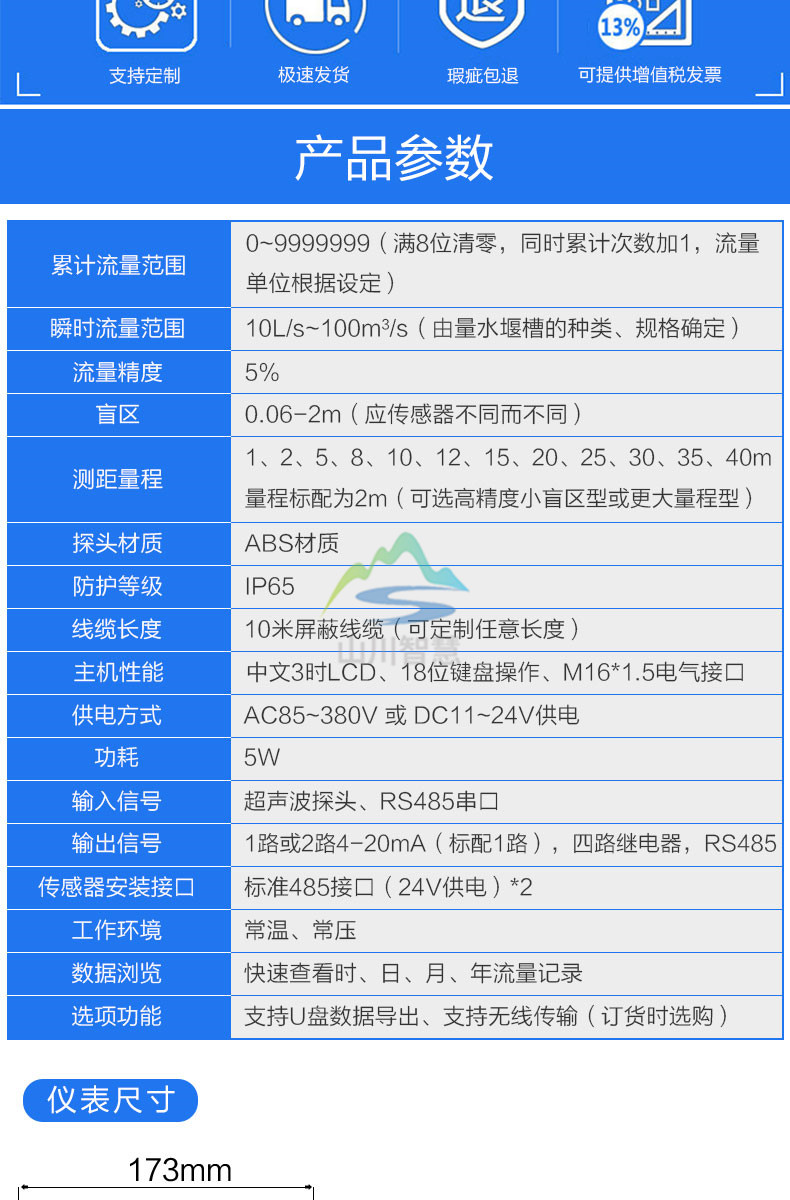 SC-LSBMQ 超聲波明渠流量計(jì)直接測(cè)量的物理量是液位。用于明渠測(cè)流量時(shí),在明渠上安裝量水堰槽。量水堰槽把明渠內(nèi)流量的大小轉(zhuǎn)成液位明渠流量計(jì)的高低。明渠流量計(jì)測(cè)量量水堰槽內(nèi)的水位,再按相應(yīng)量水堰槽的···