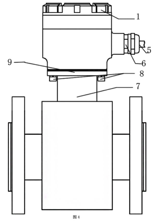 本實(shí)施例如圖4所示,分體接線盒用4只M6的螺釘8將殼體3與固定在流量傳感器7上端,売體3與傳感器7之間采用橡膠密封墊9密封。端子排7用兩個M4的螺釘固定在殼體內(nèi),接線端子通過連接電纜5,穿過安裝在売體上的格蘭頭6連接到變送器。分體蓋1通過螺紋擰緊在殼體3的上端,分體蓋1與殼體3的密封采用0型圏密封。使用時電纜與管道軸線方向一致,管道為垂直方向時,電纜出線方向朝下,從而不會造成外部的液體流入殼內(nèi)。