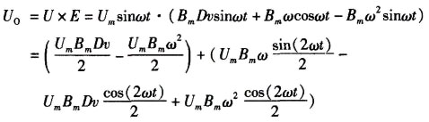 式(7)中,( BmDvsinωt)項(xiàng)為水流切割管內(nèi)磁感線產(chǎn)生的電動(dòng)勢;磁場強(qiáng)度Bm、管內(nèi)直徑D和ω都是已知量;v為要求的水流速度;[2πf Bmcosωt-(2πf)2?Bm sinωt]項(xiàng)為干擾電動(dòng)勢。由于信號構(gòu)成存在差異,所以去除干擾信號的方法有很多種。例如:干擾信號與流量信號存在90°的相位差,可以用相敏檢波的方法去除干擾信號;干擾信號與流量信號頻率不同時(shí)可以用帶通濾波、帶阻濾波、高通濾波和低通濾波的方法。從式(7)中可以看出:流量計(jì)的干擾信號與流量信號都是交流信號,頻率相同但相位差不同。上面提到的方法不能完全去除此流量計(jì)的干擾,所以筆者采用如下方法,將流量計(jì)電極間信號E與勵(lì)磁電壓信號U相乘處理,得到電壓U0如下式: