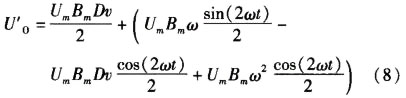 由式(8)可以看出信號經(jīng)過信號處理之后得到U'0,交流部分[UmBmω*sin(2ωt)/2]-[UmBmDv*cos(2ωt)]+[UmBm ω 2 cos(2ωt)/2]可經(jīng)過低通濾波器濾除,直流部分UmBm Dv/2經(jīng)過放大后直接輸人MCU進(jìn)行處理轉(zhuǎn)換成流量信號顯示出來。